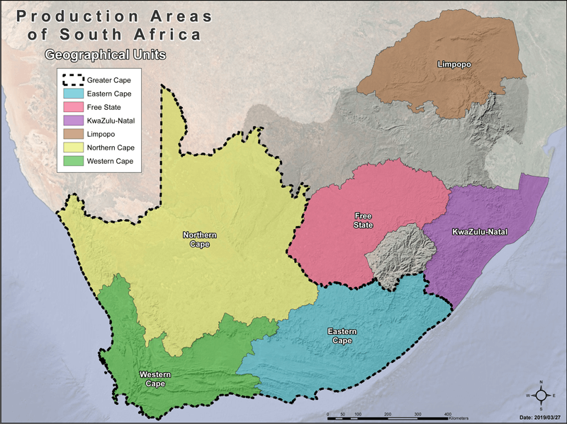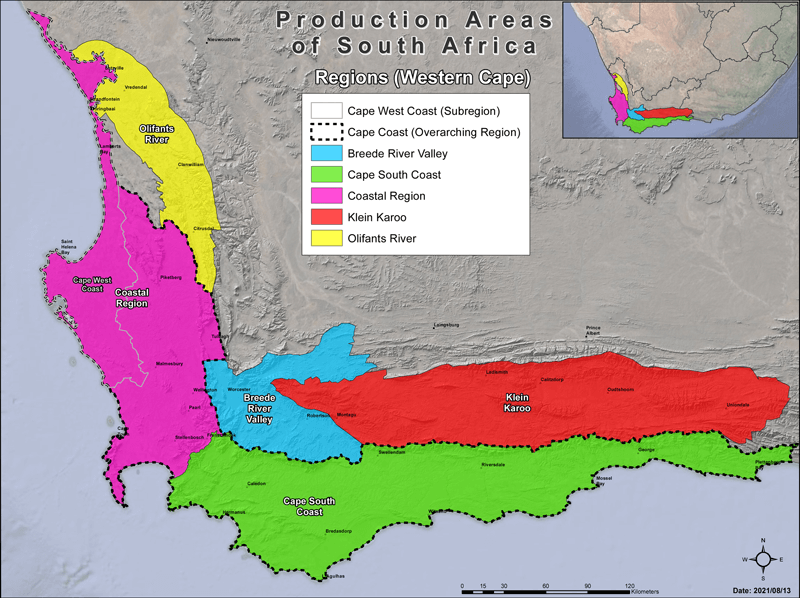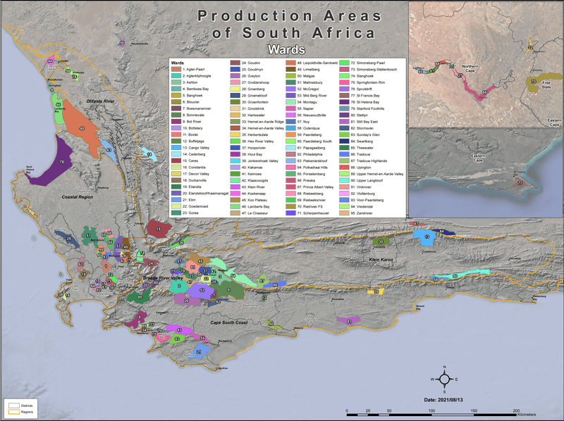 Die nächste abgegrenzte Produktionseinheit ist eine Region,  Klein Karoo und Coastal Region die eine Kombination verschiedener Bezirke oder Teile von Bezirken ist.